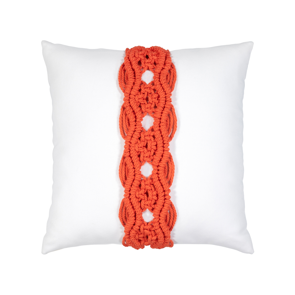 This embellished design is celebrating the beauty of craftsmanship made here in the USA. The hand woven macrame center band adds dimension and contrast to a classic solid color pillow. Crafted using Sunbrella yarns, this indoor/outdoor pillow make it a dramatic statement piece.