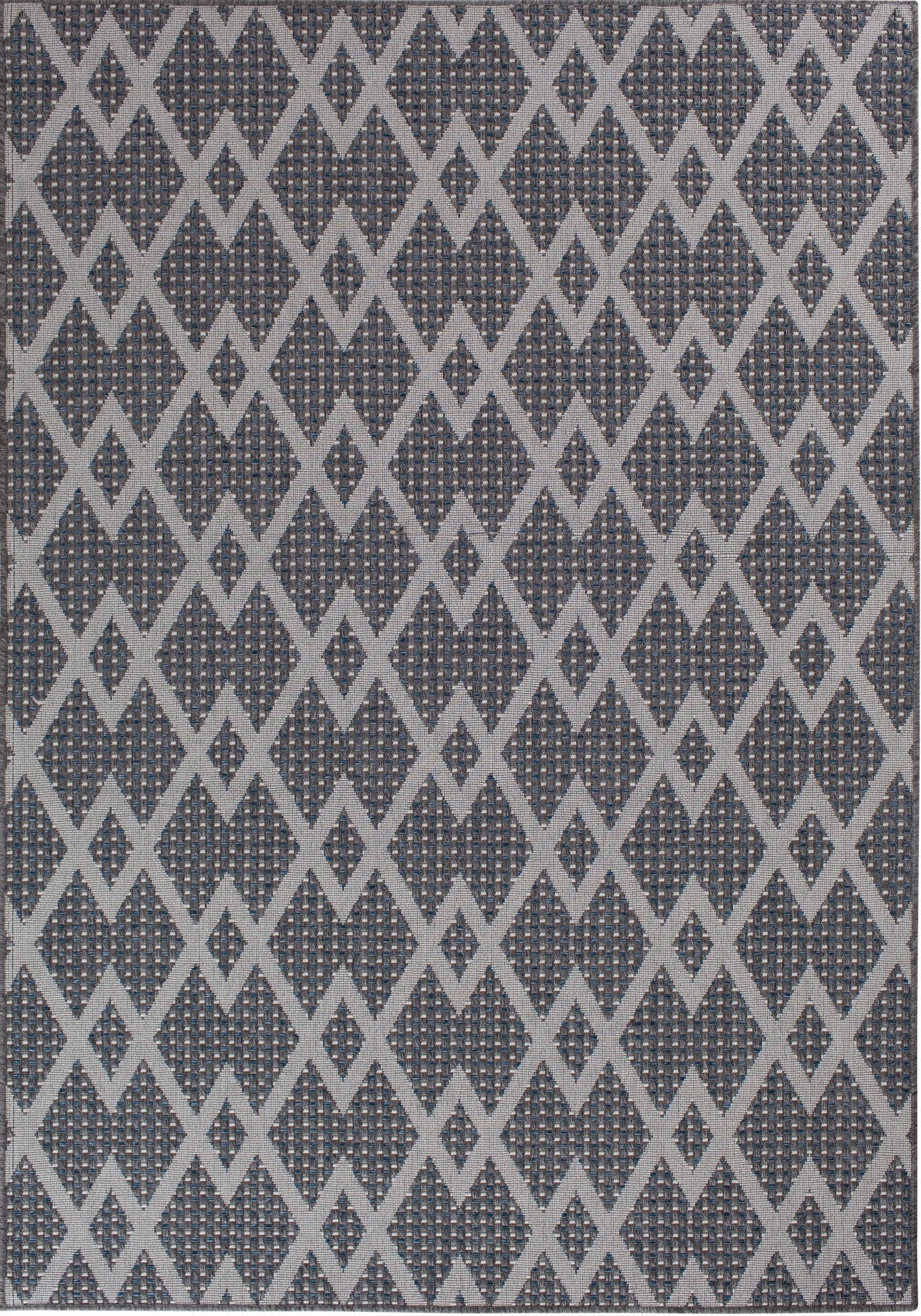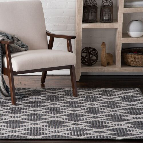 Suitable for indoor and outdoor areas, the New Zealand Collection was inspired by the rich look of wool flat woven rugs. The Diamond Chevron design incorporates a chevron pattern in the transitional styling. Primary colors are ecru and granite.