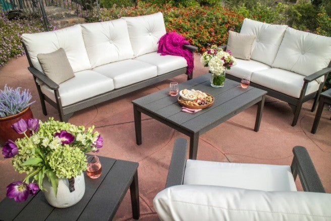 - Quick-drying, durable cushions covered in all-weather performance fabric that resists weather, salt, sun, mold, and mildew